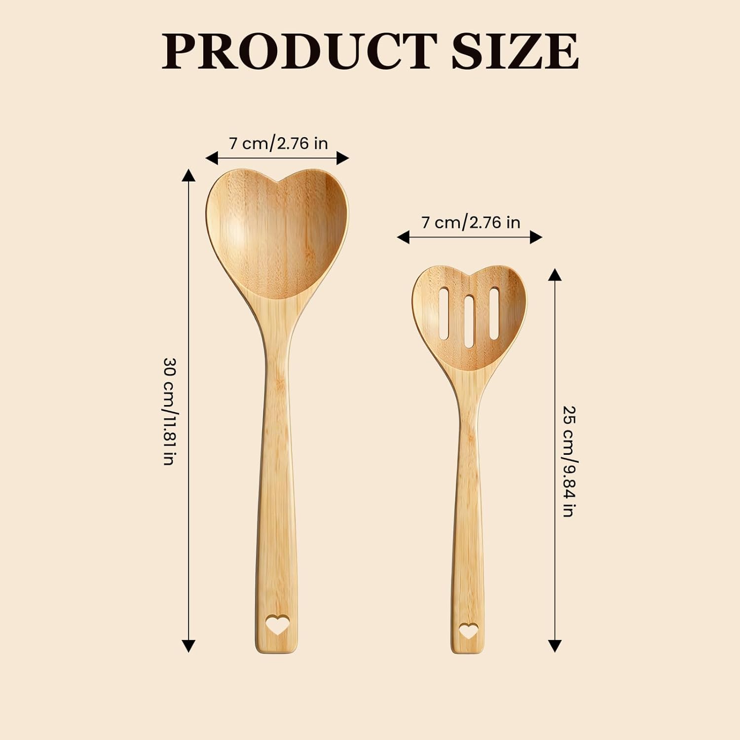 Designed with an endearing heart shape and a matching heart-shaped hole in the handle, each spoon adds a warm, decorative touch to your space and allows for easy hanging storage. The set provides two practical styles (solid and slotted), making them ideal for essential tasks like stirring, mixing, and sautéing. Their generous 10” and 12” lengths offer comfortable handling in various cookware.