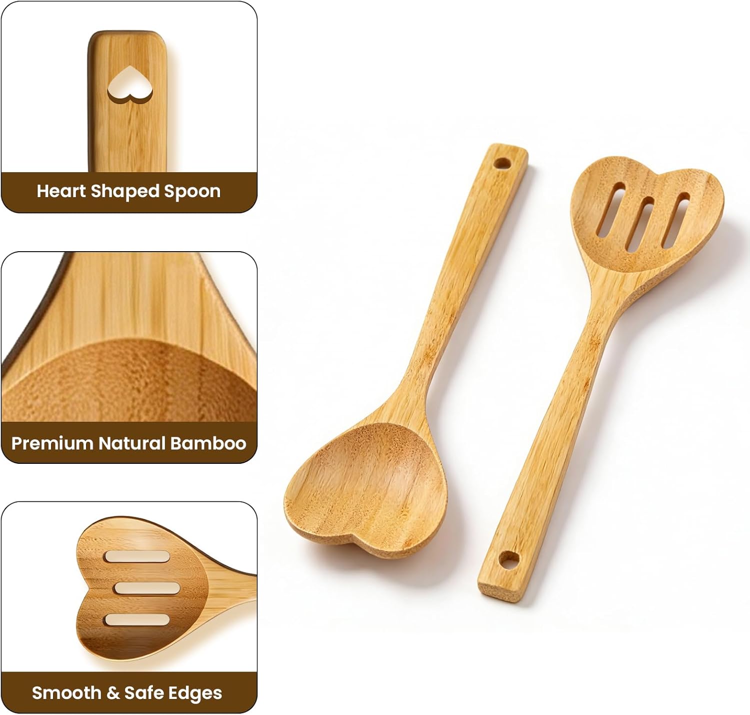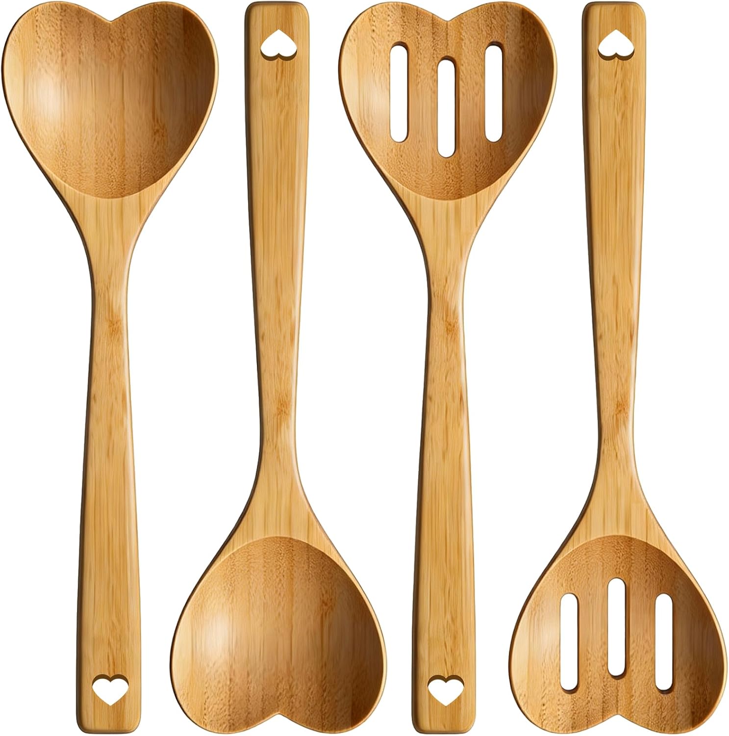 Discover the perfect blend of charm and utility with the Frstem Bamboo Heart Shaped Spoon Set. This 4-piece collection includes two solid and two slotted spoons, offering versatile bamboo cooking utensils for all your kitchen needs. Crafted from natural, sturdy bamboo, these bamboo spoons for cooking feature a smooth finish that is gentle on your pots and pans while providing a comfortable, reliable grip.